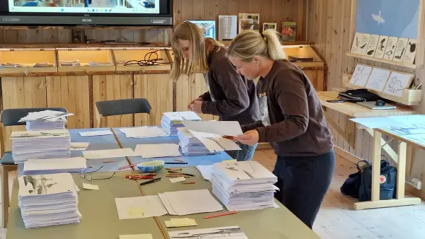 Prosjektmedarbeiderne Mathilde og Line sorterer tegninger til animasjonsfilmen "Lappspovens farefulle ferd"
