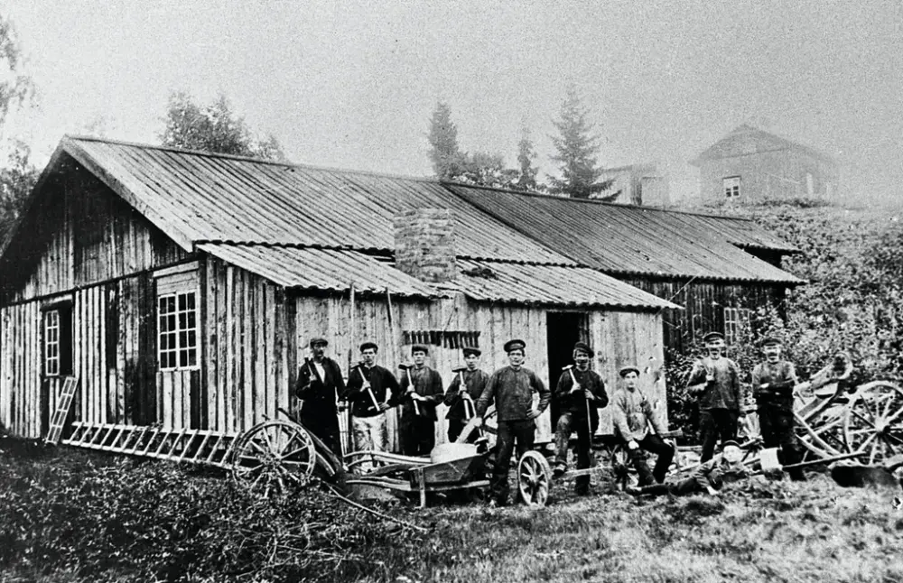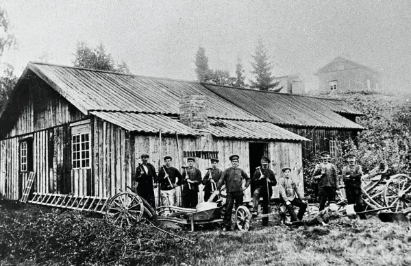Den gamle Bodinsmia ved Holt, ca. 1910. Fra venstre: Edvin Bodin, Sverre Olsen, Einar Olsen, Adolf Solberg, Harald Olsen, Emil Olsen, Fridtjof Bodin, Gustav Bodin, Olav Solberg, og Birger Bodin (liggende). Foto: Akershusbasen