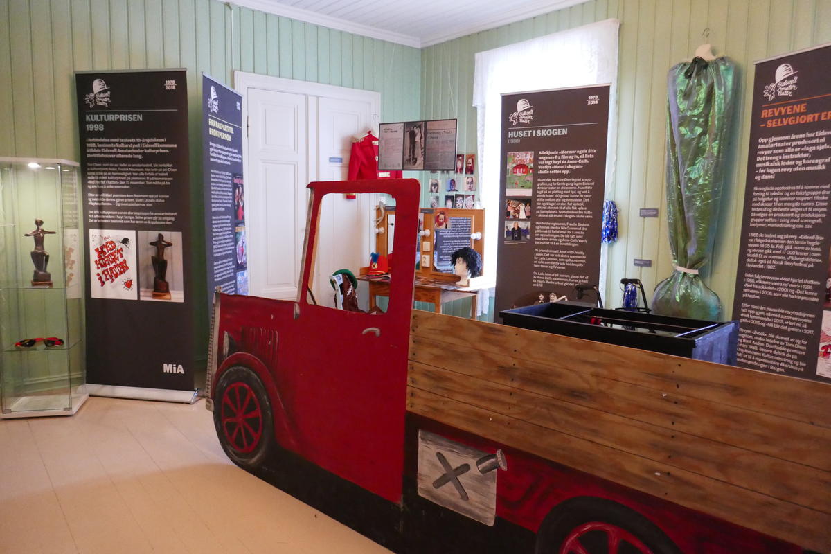 I utstillingen kan du se kostymer og rekvisitter fra forestillingene, "prøvekjøre" lastebilen til "Mormor og de åtte ungene", se filmklipp fra forestillingene eller bla deg gjennom alle plakatene fra de ulike forestillingene. Her får du servert artige historier om hendelser, enkeltpersoner og forestillinger.