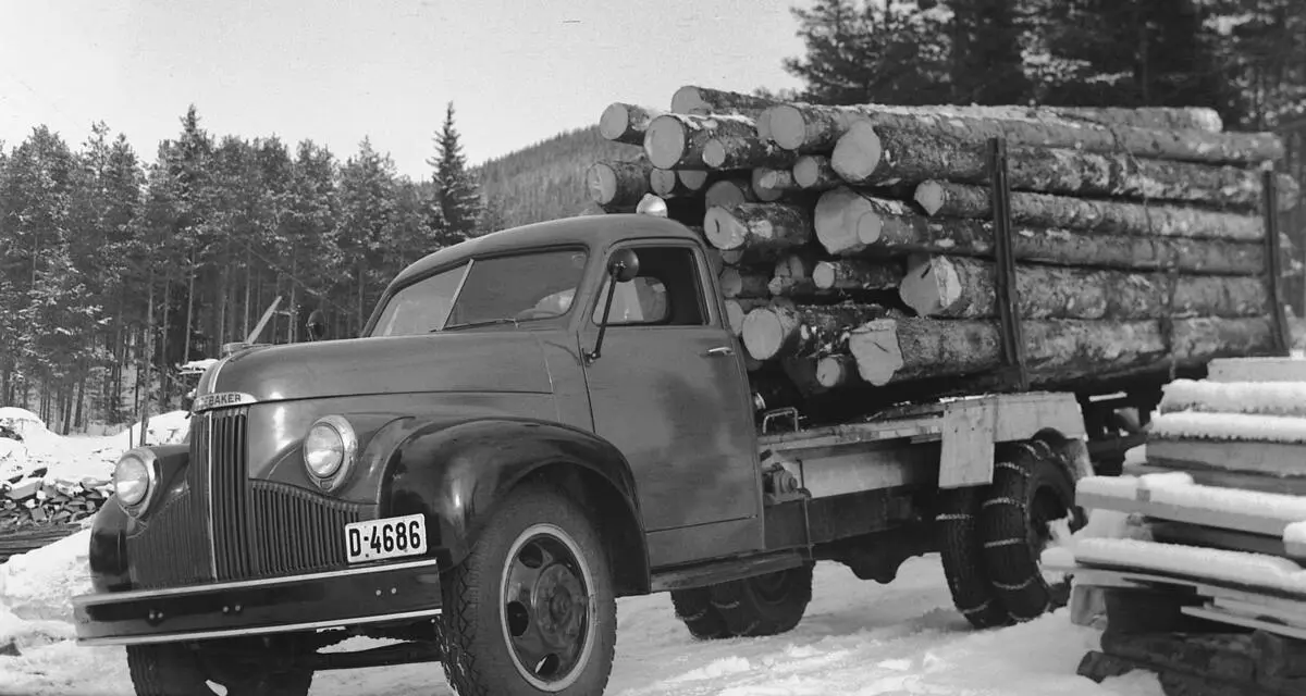 Studebaker lastebil med tømmerlass, 1946-48 Prestkværn, Håkon
