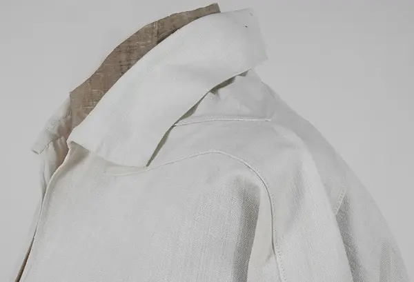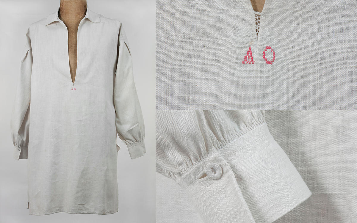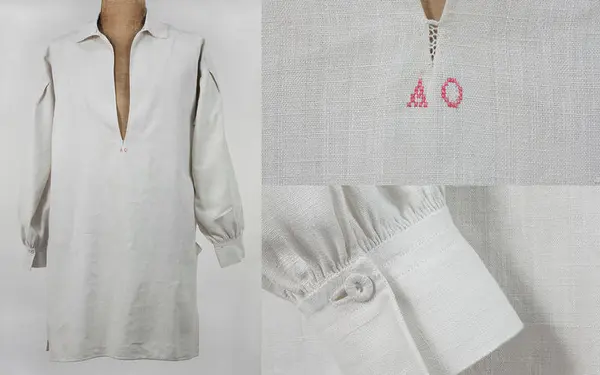 Skjorten er laget av lin som er dyrket, bearbeidet og vevet på Hokholt på Nesodden. Skjorten har initialene til AO, men vi kjenner ikke til hvilket navn dette henspiller på. Dette er modellen for bunadskjorten til mannsbunaden.