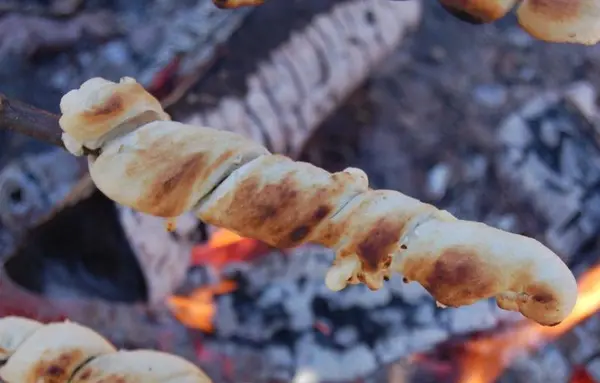 Vi fyrer opp bålpannen. På denne kan du grille pølser og pinnebrød, som selges i kaféen. I kaféen selges også eplekake med krem og vafler.