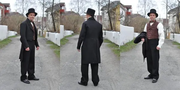 Mannsbunaden består av kjole i toskaft ullstoff, vest og lange bukser med bukseklaff. Bunaden har et snitt preget av både europeiske mote i tiden 1830 til 1850 og lokale tradisjoner i utførelse og stoffvalg, med bruk av både importerte og hjemmeproduserte materialer.