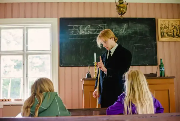 En av våre dyktige museumsformidlere holder en skoletime på gamle Holstad skole. Elevene får prøve å skrive med tavle og griffel, de lærer seg regler og får se hvordan et klasserom kunne vært i gamledager. Museumsformidler går også ut og inn av lærerrollen på barnas premisser, og slik får elevene oppleve hvordan en gammeldags lærer kunne være.