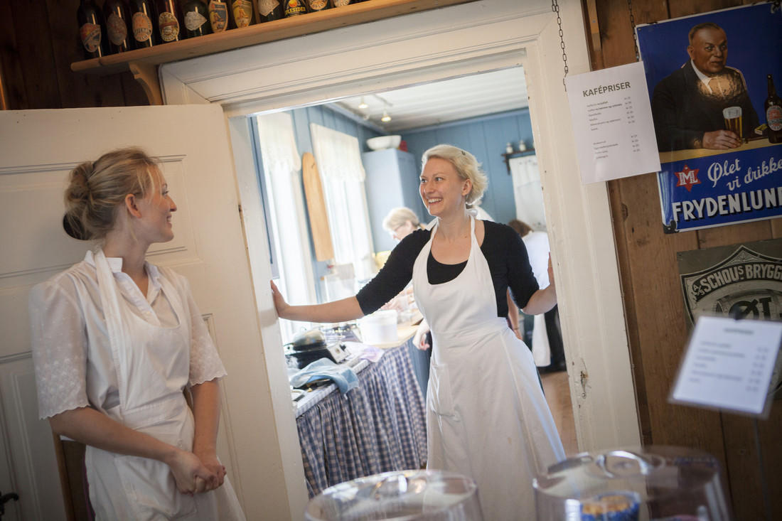 I Gulbygningen finner du vår koselige kafé. Her serverer våre hyggelige sommeransatte nystekte vafler, kaffe, kaker, is og mineralvann. Spis gjerne inne eller ta med deg maten ut i vår innholdsrike hage.