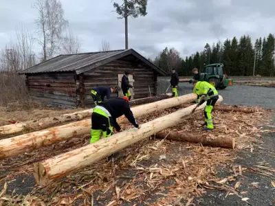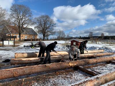 Det første tømmeret kom til museet i januar 2023, og dette markerer starten på barkeprosjektet på museet. Å barke tømmer er å fjerne barken, før tømmeret tørkes og brukes. Dette skal gjøres på gamle måten med barkespade, meddragskniv og øks.