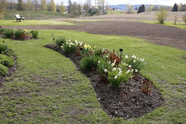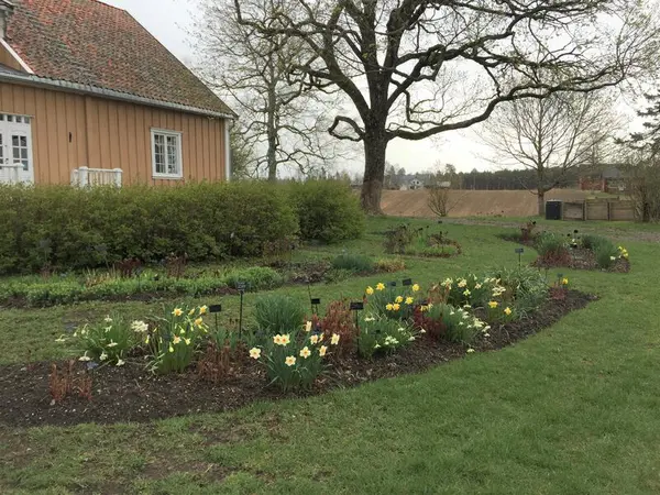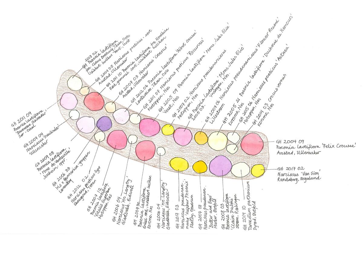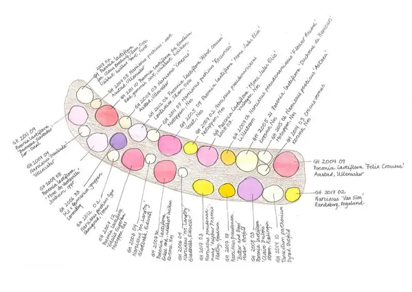 Dette er et praktfullt bed fra tidligste vår til midt på sommeren. Det begynner med en hvit krokus (Crocus) som kom som blindpassasjer med en silkepion. Det fortsetter med mange ulike narsisser (Narcissus) før silkepionene springer ut i all sin kraft. Etter at silkepionene har blomstret ferdig, skjer det ikke så mye. Matrem (Tanacetum parthenium) og stemorsblomst (Viola tricolor) får lov å forville seg i bedet.