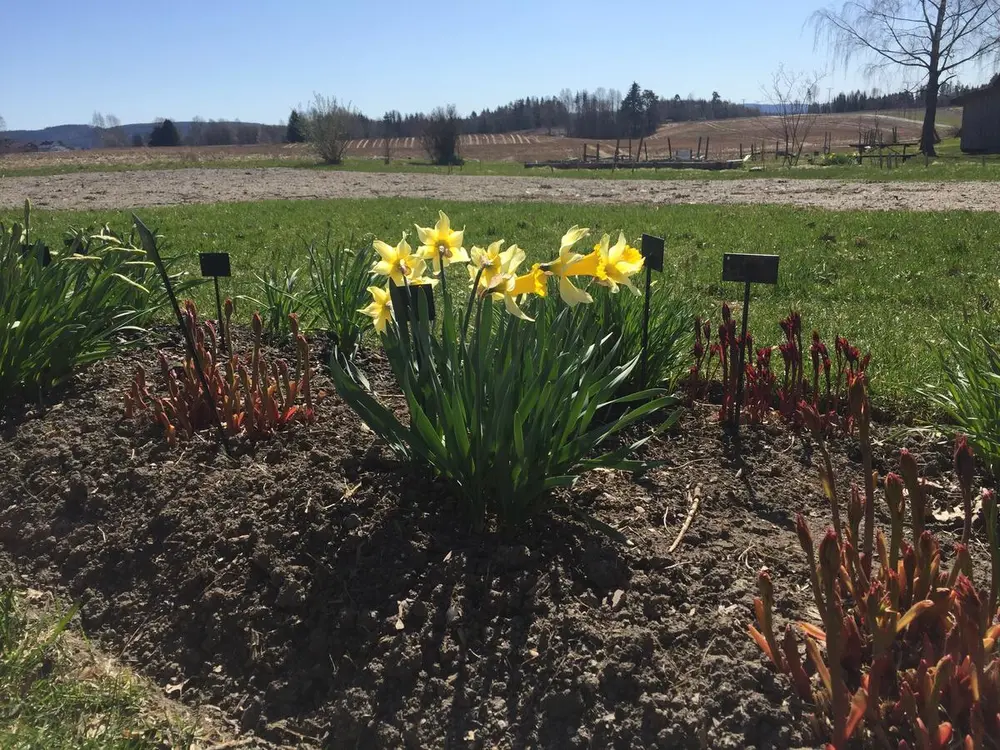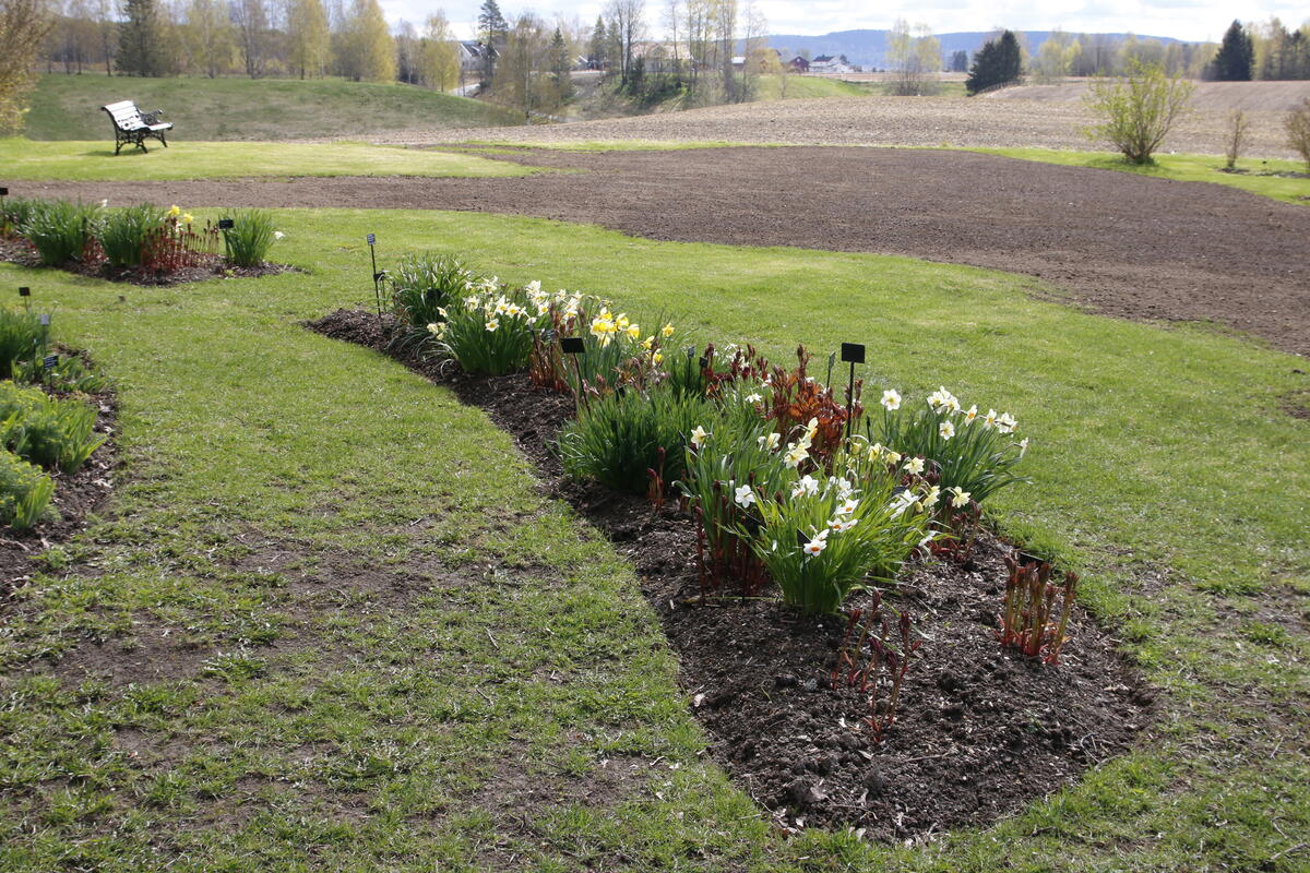 Etter krokusen kommer narsissene (Narcissus), det vil si ulike arter og sorter av påske- og pinseliljer. De stortrives her i alt lyset. Mari Marstein/MiA - 4/7