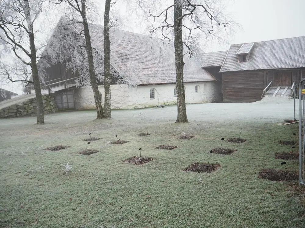 Pionbedene ved stabburet i frost høsten 2020. Mari Marstein/MiA