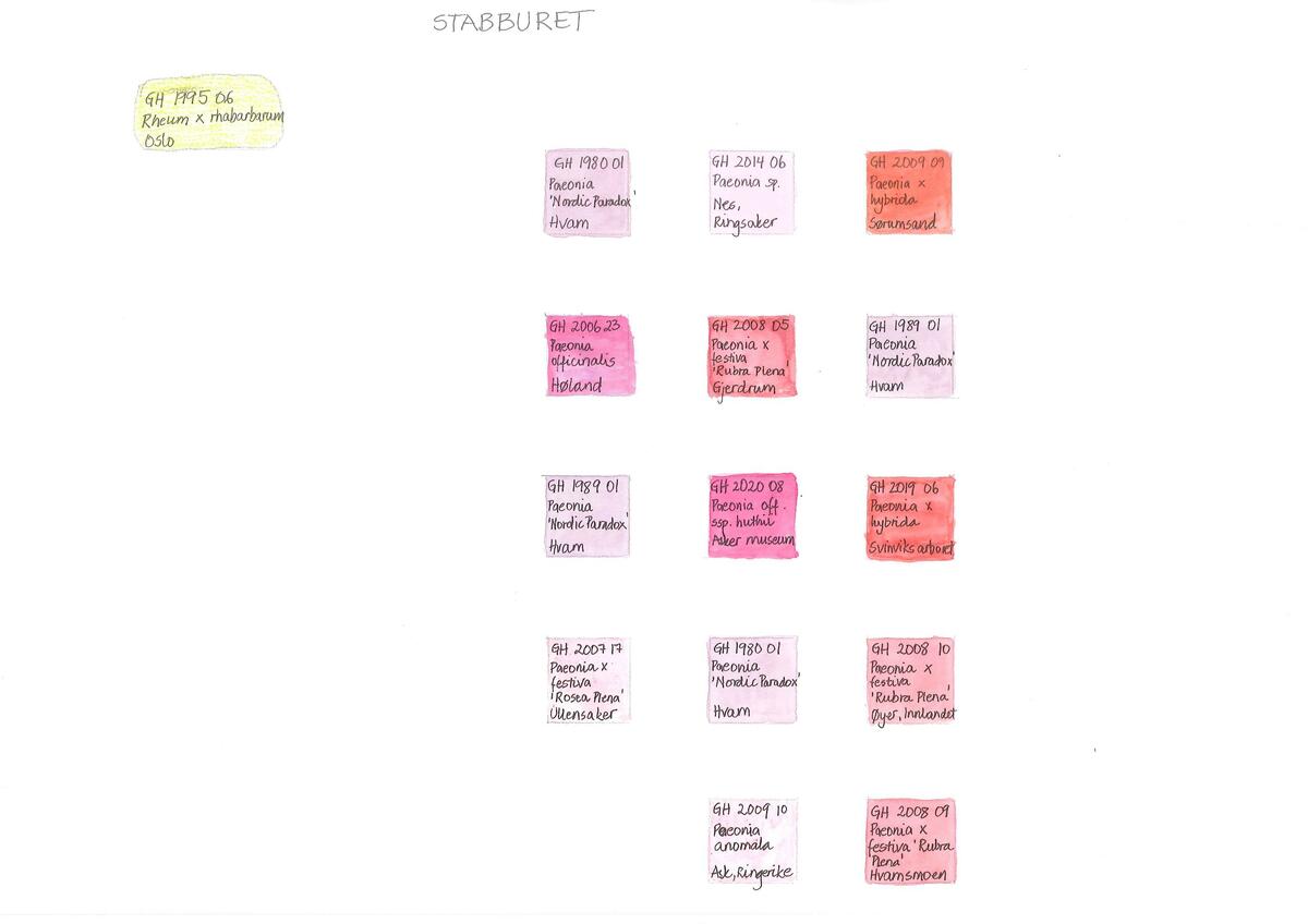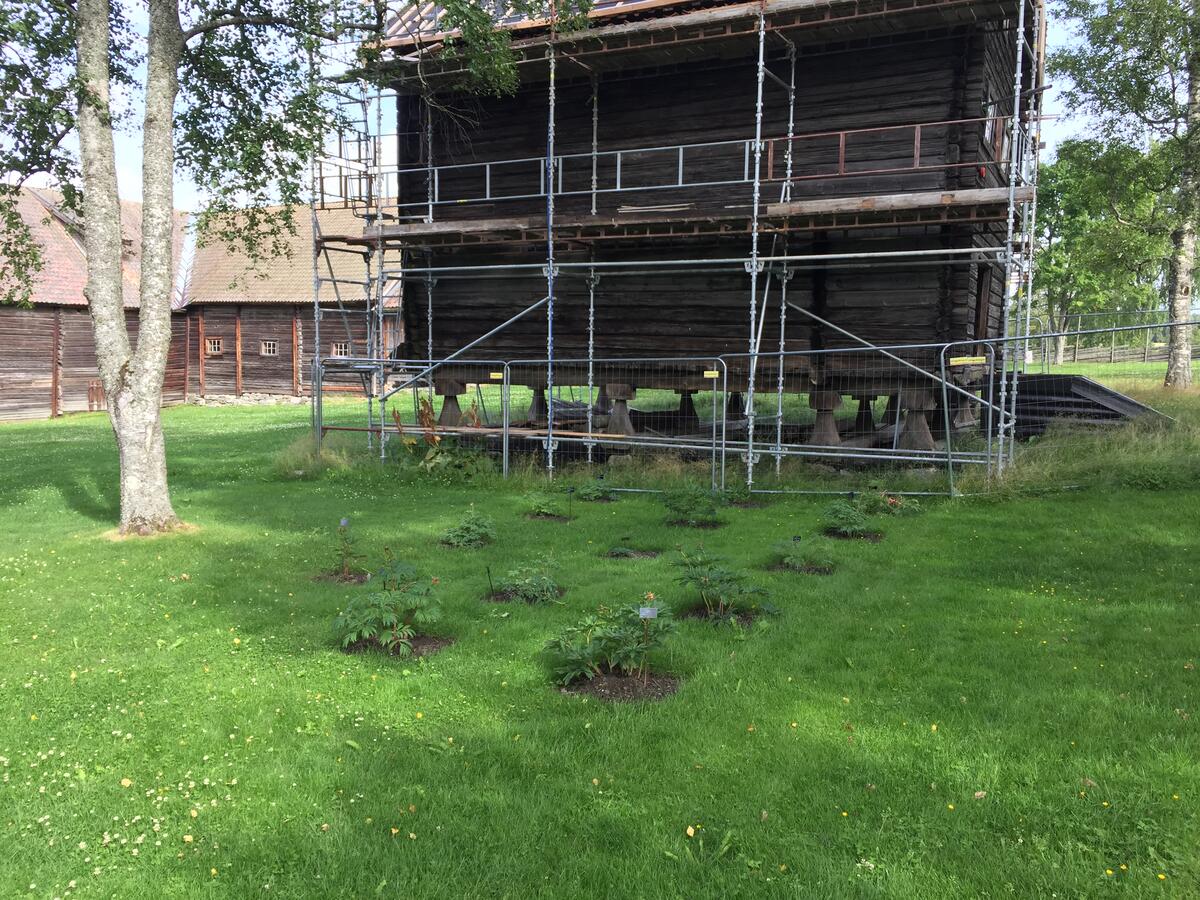 Den gamle rabarbraen har stått her siden 1990-tallet. Alle de europeiske pionene ble flyttet hit i forbindelse med dreneringen i 2019. Her vokser de under tilnærmet like forhold, og det er lettere å observere og sammenligne plantene.