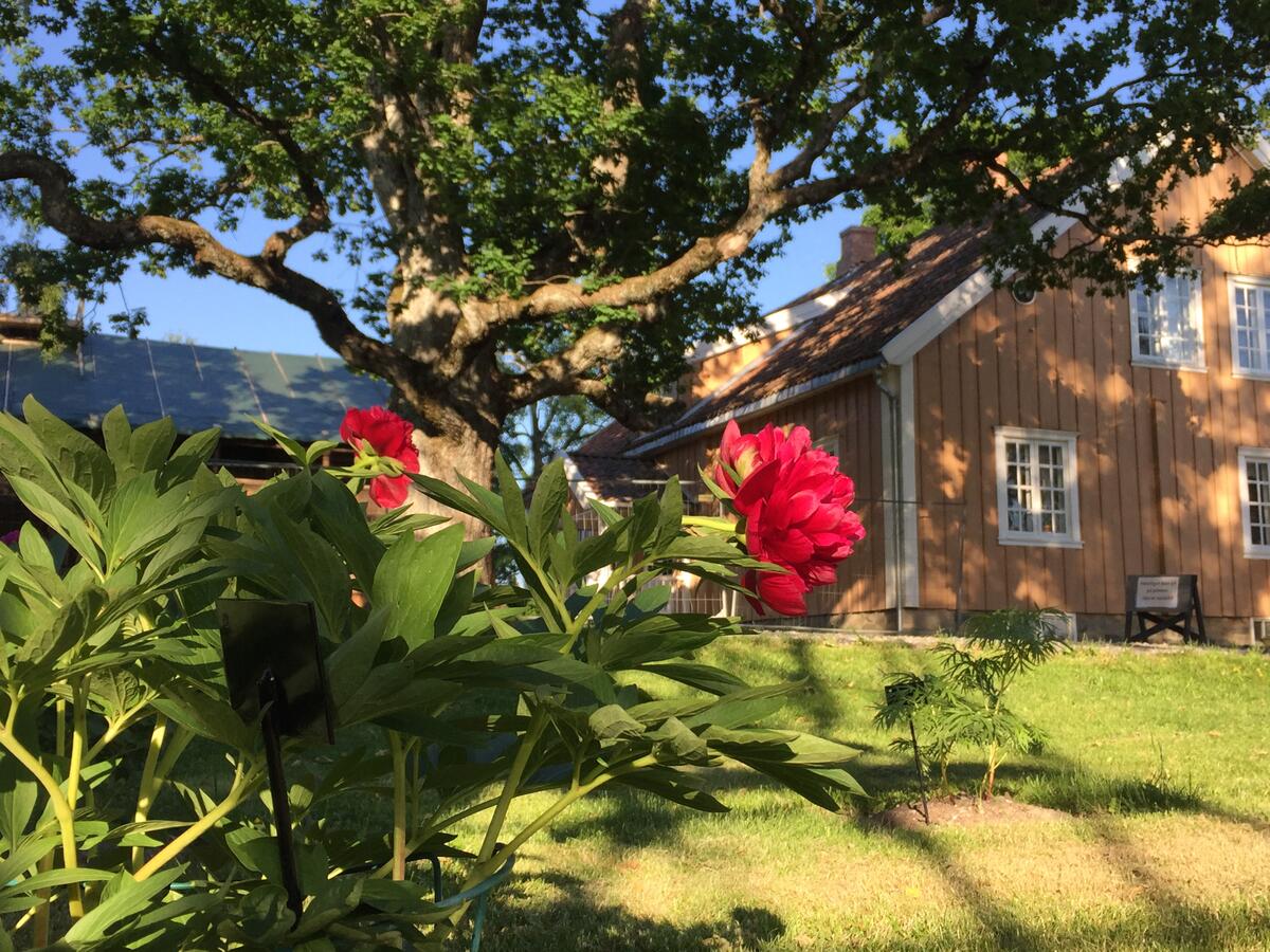 Denne lille pionen stammer etter all sannsynlighet fra Lars Bredesen, som kjøpte gården i 1819. Han må ha fått den fra John Collett på Store Ullevål, som han hadde jobbet for. Pionen er trolig innført til Norge fra England av John Collett. Den har nå fått navnet Paeonia 'Nordic Paradox'. Mari Marstein/MiA - 11/12