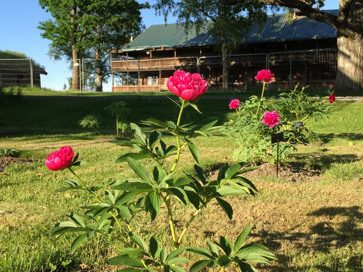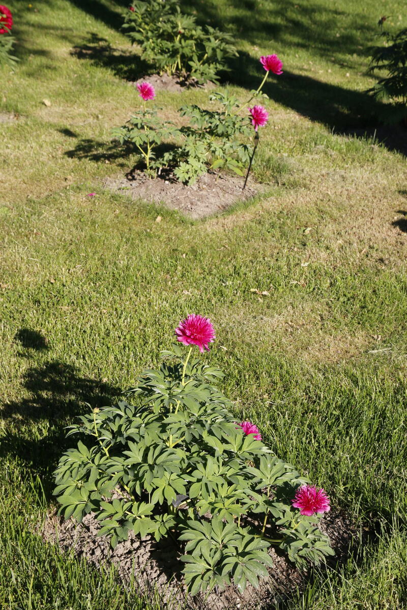 Bondepionene 'Paeonia 'Rosea Plena' i blomst, med planter fra tre ulike gårder på Østlandet. Mari Marstein/MiA - 8/12