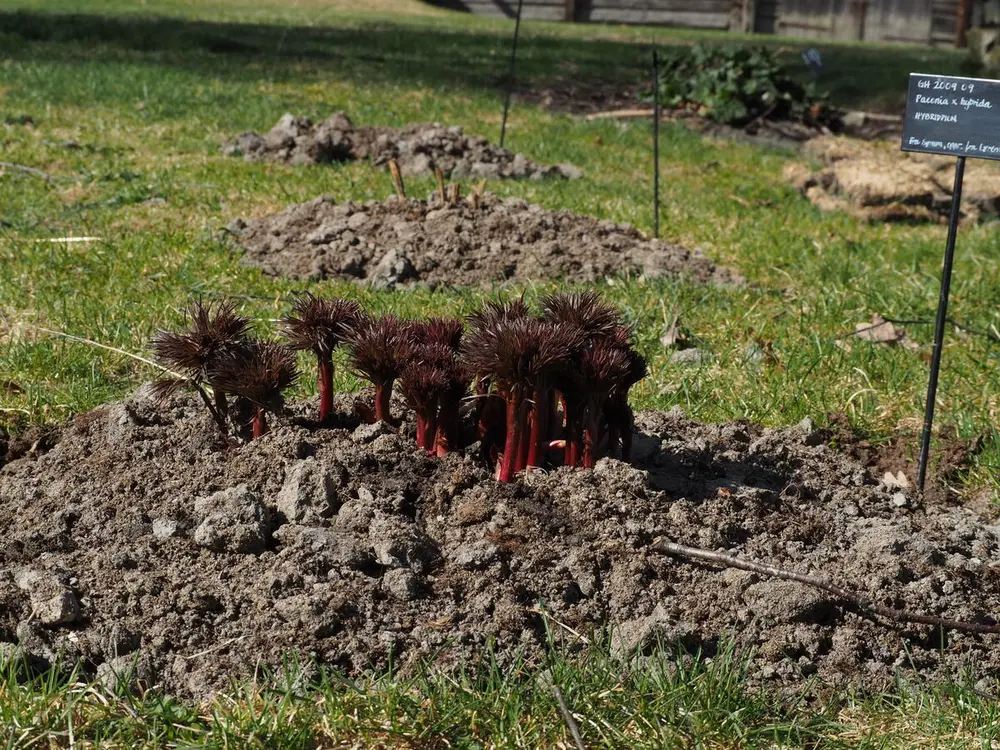Paeonia x hybrida kommer med morsomme dusker tidlig på våren. Dette er den første som kommer i blomst av de europeiske pionene vi har samlet inn. Mari deltar i en finsk undersøkelse av slike pioner i Norden. Mari Marstein/MiA - 5/12