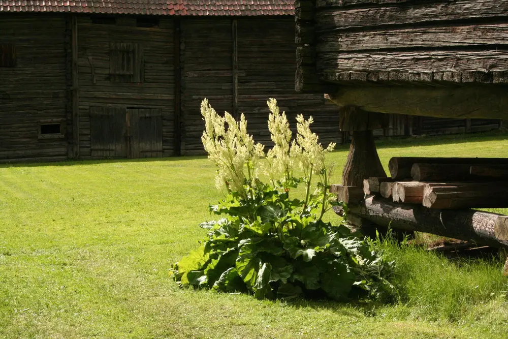 Denne gamle rabarbraen har fulgt Maris familie helt siden 1932. Den er blitt flyttet fra Frøen i Oslo, der familien bosatte seg i 1932, til Holmendammen, der de bygde hus tidlig på 1950-tallet. Mari Marstein og Tom Jøran Bauer, som fikk jobben med å bygge opp Gamle Hvam fra 1980, tok med seg ei rot til Granhaugen, en av boligene under Akershus landbruksskole. Derfra ble det delt av ei rot til museet. Mari Marstein/MiA - 3/12