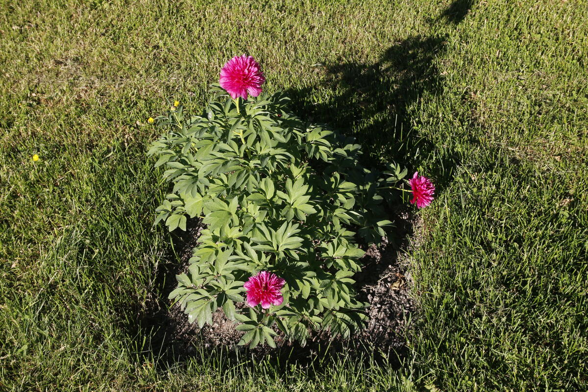 Paeonia x hybrida i blomst. Dette kan være en spesiell krysning som bare finnes i Norden. Mange kaller den dillpion, men en dillpion (Paeonia tenuifolia) skal ha enda smalere blader. Mari Marstein/MiA - 4/12