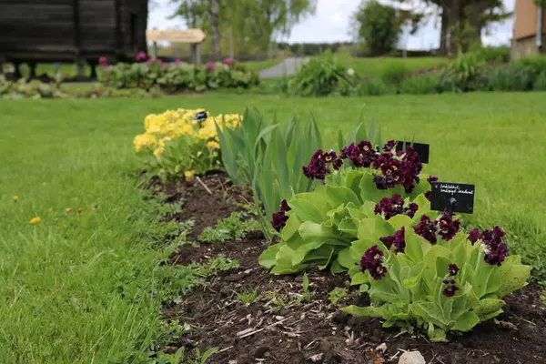 Tre ulike aurikler og fire ulike hageiris, fra venstre: Tofarget blå hageiris fra Hovelsrud, tofarget blå hageiris fra Hemnes, hageiris fra Lørenskog med gulbrune faner og lilla fall med hvite årer, og hageiris fra Mårbacka, Selma Lagerlöfs hjem i Värmland. Den siste har også gulbrune faner og lilla fall med hvite årer, men den er mye større og kraftigere enn irisen fra Lørenskog. Det er svært nyttig å la dem vokse i samme bed. Da ser man likheter og forskjeller mye bedre. Mari Marstein/MiA - 3/5