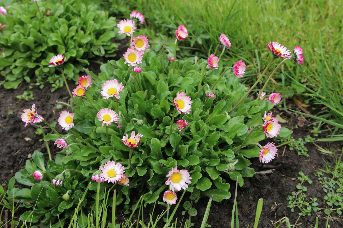 En frodig tue med tusenfryd, Bellis perennis. Nå begynner den å spre seg fra bedet og ut i plenen rundt. Det skal den få lov til. Mari Marstein/MiA - 4/5