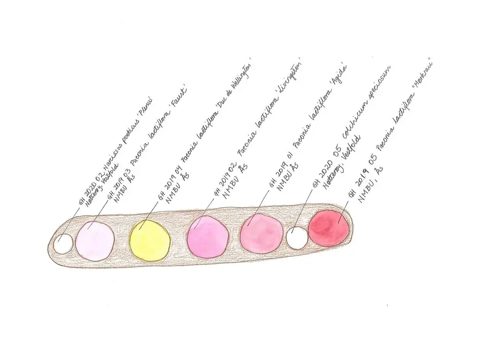 Som i bed 24 vokser det her silkepioner som vi har fått fra parken ved NMBU, Norges miljø- og biovitenskapelige universitet på Ås. Der ble de plantet i 1930. Dessuten finner vi her en tidløs (Colchicum speciosum) og en fylt pinselilje (Narcissus poeticus 'Pleno') fra Nøtterøy i dette bedet. Siden bedet ble etablert og pionene ble plantet i 2020, finnes det ingen gode bilder. En georgine (Dalia) fra Eidsvoll ga fin farge til bedet dette første året.