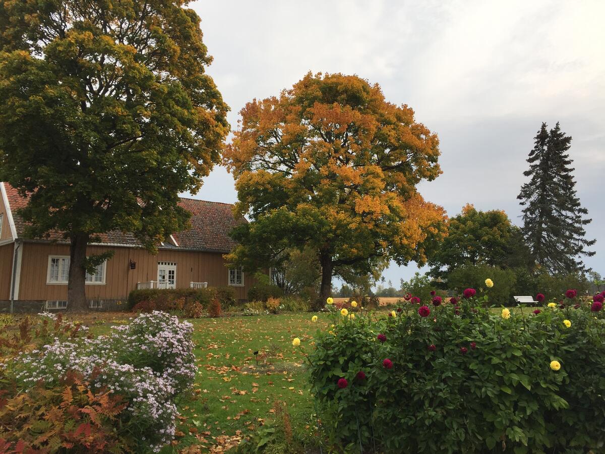 Georginebedene er hagens midtpunkt om høsten. Mellom disse ligger et bed med to rosebusker og noen narsisser som trengte en nødplassering. Ved enden av rognspireahekken har en hageasters (Symphyotrichum versicolor) forvillet seg, og de andre plantene vi har av samme slaget, er nå plantet ved lekestua.
