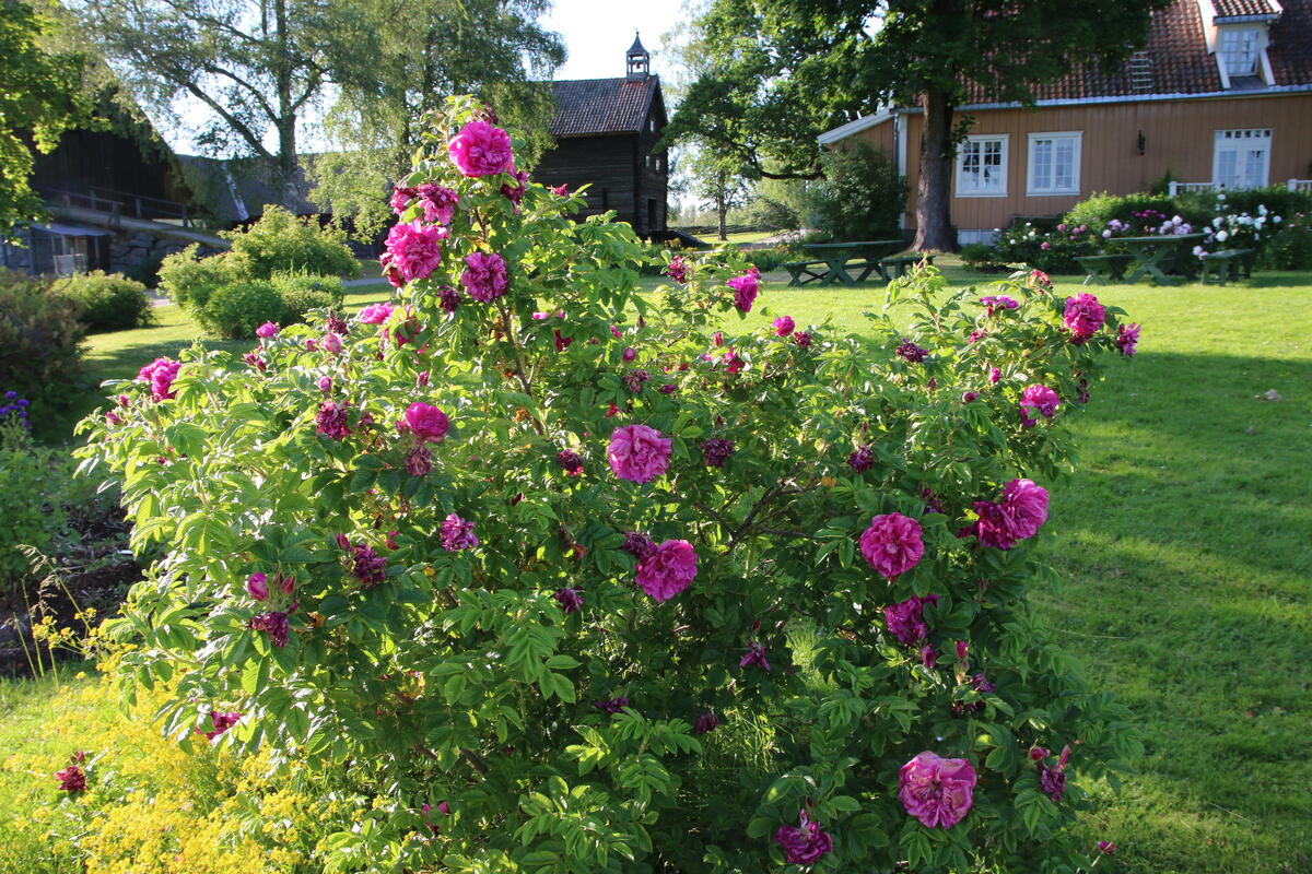I bed 27 blomstrer en kraftig rose i juli. Det er muligens sorten 'Nordens Dronning', en sort som finnes ofte i Norge og Finland, men sjelden i Sverige. Mari Marstein/MiA - 5/7