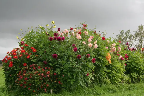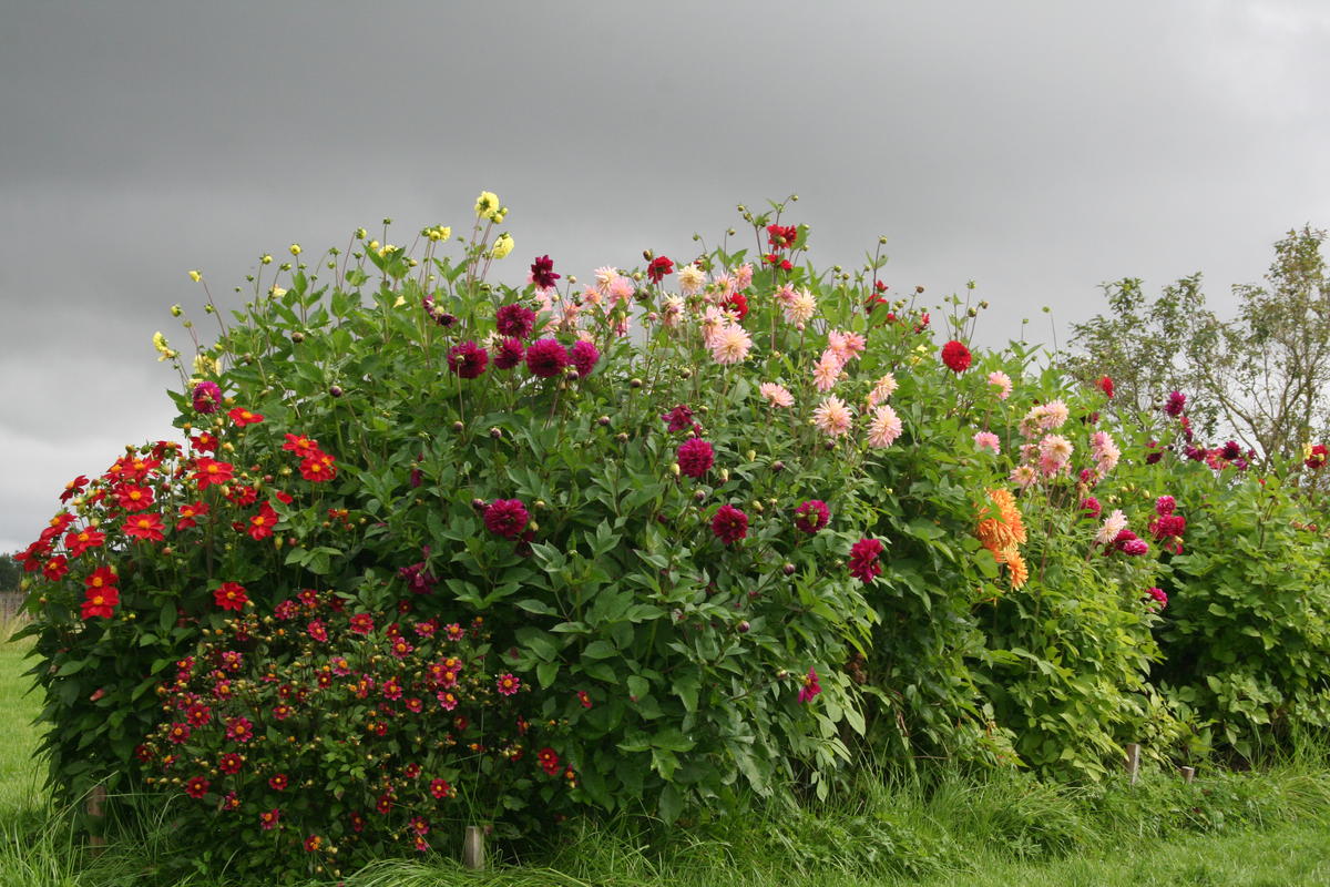 Et georginebed i full blomst er en fryd for øyet. Vi har ca 15 gamle georginesorter (Dahlia). De eldste er ikke identifisert, men de er de mest robuste. De klarer overvintringen best. Foto: Mari Marstein/MiA - 7/7