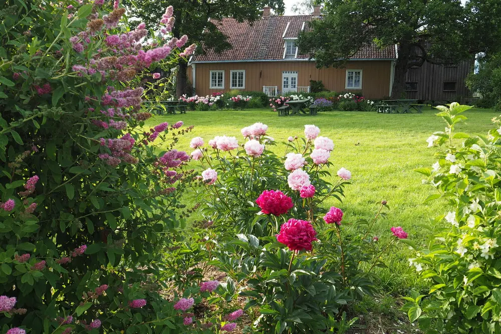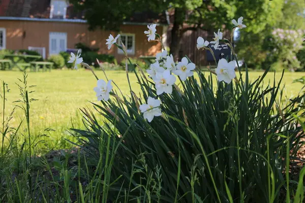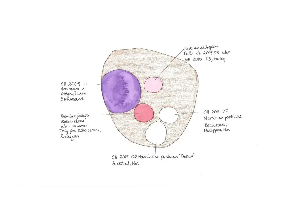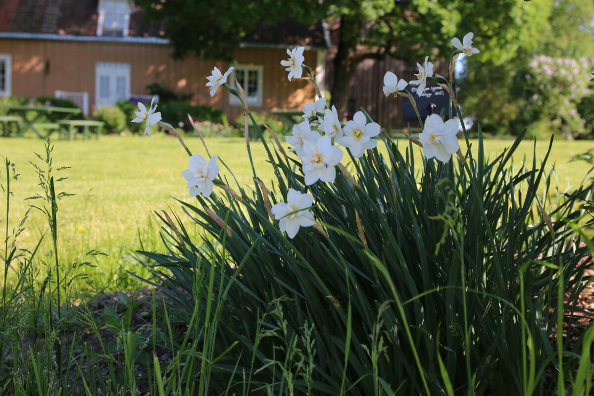 Seint i mai blomstrer fylte pinseliljer (Narcissus poeticus 'Pleno') i dette bedet. Her på Østlandet har pinseliljer vært mye vanligere enn påskeliljer. Vi ar to eller tre ulike sorter v fylte pinseliljer på Gamle Hvam. Mari Marstein/MiA - 3/3