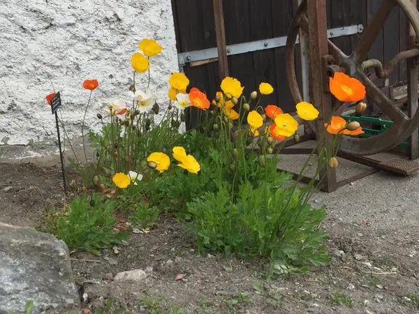 Dette bedet er oppstått av seg selv. Sibirvalmuene (Papaver croceum) vokste opprinnelig inne ved fjøsveggen, men ble klippet bort av gressklipperen. Plutselig dukket de opp igjen ved verkstedet. Nå luker vi området slik at de skal få spre seg over hele det området de selv har valgt.