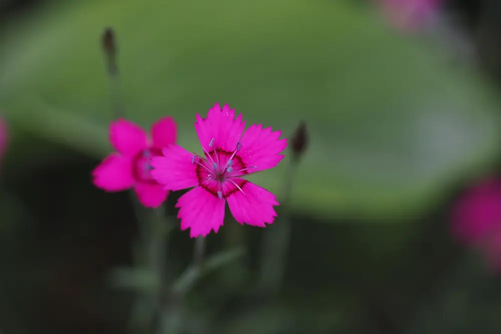 Blomsten er liten, men intenst fargesterk. Blå pollenknapper løfter seg opp fra den skarpt rosa blomsten. Foto: Mari Marstein/ MiA