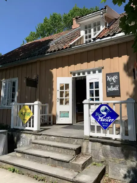 Kafédøra ble skiftet ut i vår. Døra som ble fjernet, hadde stått siden 1995 og var sterkt preget av vær og vind. Vi visste om omfattende råteskader i døra, men det ble og avdekket råteskader rundt inngangspartiet. Arbeidet viste seg derfor å bli mer omfattende enn først antatt. Før den nye døra ble satt inn, ble stokkene under inngangspartiet utbedret. Den nye døra er laget som en kopi av inngangsdøra på motsatt side av bygningen.