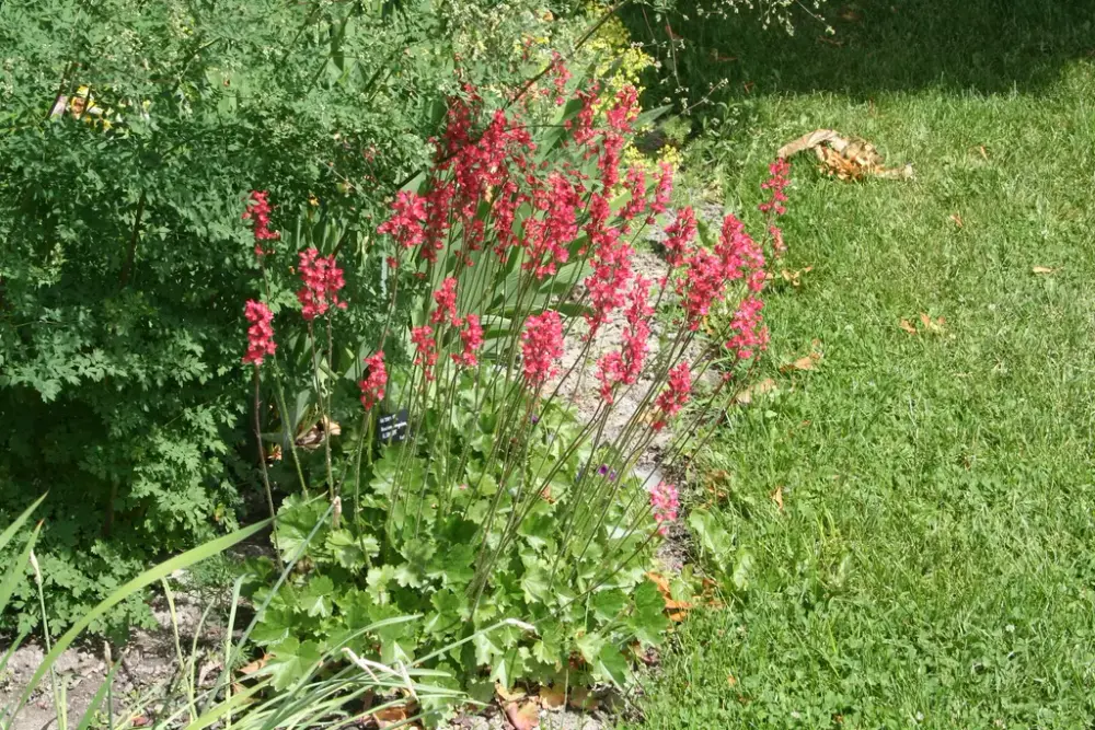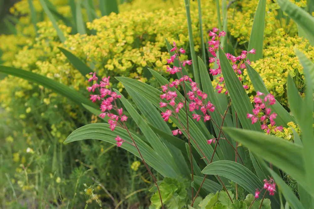 Alunrot fra Ringerike titter fram mellom hageiris og sypressvortemelk. Blomsterstilkene blir opp til 40 cm høye, og blomsterfargen er lysende rosa. Foto: Mari Marstein/MiA