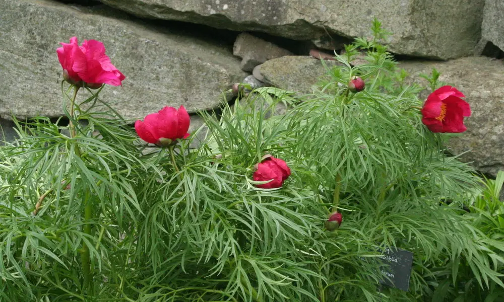 Denne pionen stod på ei slik hyttetomt i 1964. Planten var da gammel og godt etablert, så den ble beholdt av de nye eierne. Litt av rota ble gitt til naboen, som igjen ga noe til sin svigerinne i Sørum, der den gikk i arv til svigerdattera, før vi fikk ei rot til Gamle Hvam. Bladverket er smalt og fint, men ikke så fint som hos dillpion. Blomsterfargen er klar rød, og den blomstrer samtidig med P. anomala, det vil si noen dager før P. officinalis.