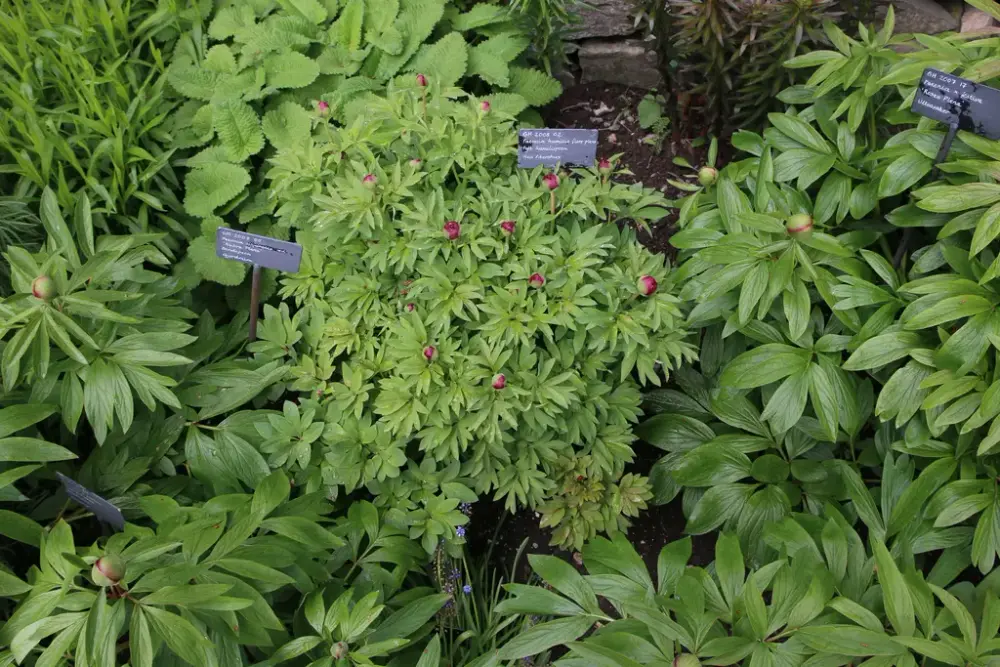Bladverket til 'Nordic Paradox' (i midten) er mindre og mer findelt enn bladverket til 'Rubra Plena' (til venstre) og 'Rosea Plena' (til høyre). Foto: Mari Marstein/MiA