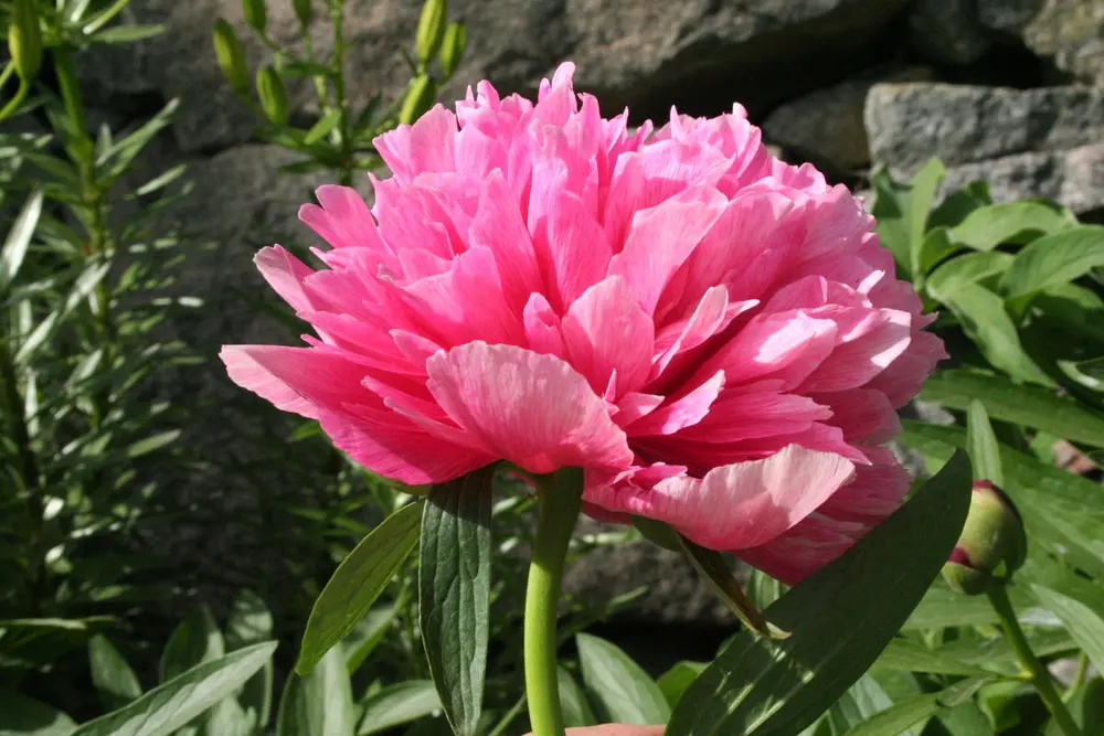 Trolig er bondepionene svært gamle også i Norge. Blomstene er store, tettfylte og vakre, og det kommer bare én blomst pr blomsterstilk. Sortsnavnene forteller hvilken farge blomsten har. På Gamle Hvam har vi de to sortene ‘Rubra Plena’ med dyprøde blomster og ‘Rosea Plena’ med blomster som springer ut som mørk rosa, men som blekner nesten til hvitt i løpet av blomstringstida, tidlig i juni. Bladverket er ikke hårete, derfor er det blankere enn hos Paeonia officinalis. Bladene har glatt bladkant, ikke ru, som hos silkepionene.