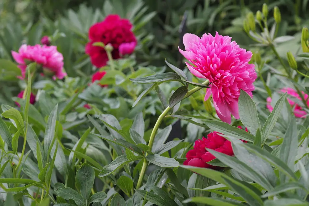 Paeonia x festiva 'Rosea Plena' er rosa, og navnet betyr rosa, fylt. - 'Rubra Plena' er rød, og navnet betyr rød, fylt. Foto: Mari Marstein/MiA
