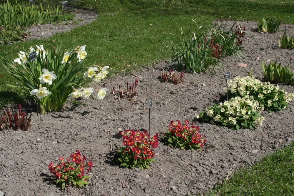 Rød hageprimula fra Ullensaker foran til venstre, den lys gule 'Dorothy' bak til høyre. Foto: Mari Marstein/MiA
