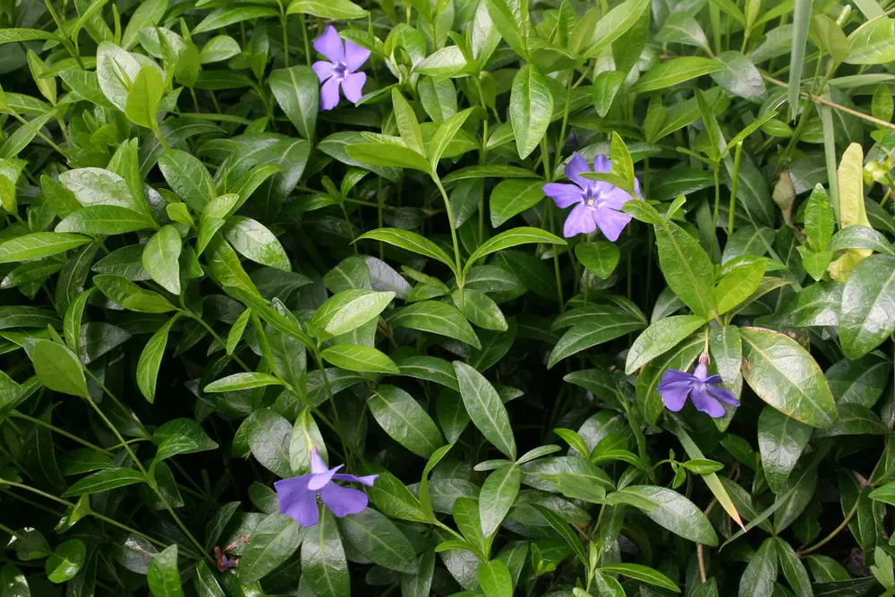 Gravmyrten vår er av de gamle staudene som har vandret fra hage til hage her på Hvam. Gartner Skancke hadde den til salgs i planteskolen sin i Vormsund, og trolig hadde han den også til salgs da han var gartner på landbruksskolen her. Vi har fått den fra Johanne Julseth, som var gift med en av lærerne på landbruksskolen. I Skanckes prisliste fra 1933 står det: "Vinca minor, gravmyrt, krypende med stedsegrønne blade, blå blomster."