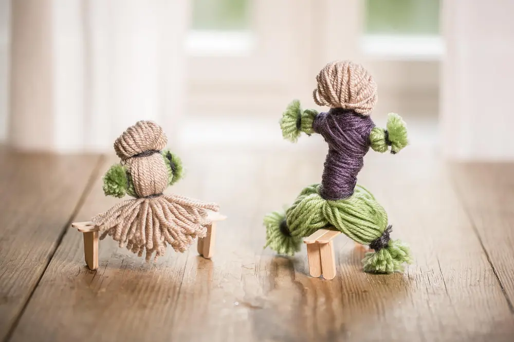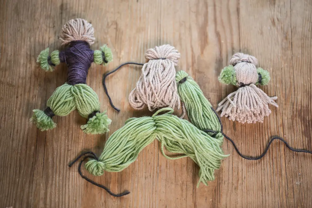 Vil du lage dukke med skjørt, fester du en tråd på midten av kroppen og klipp opp trådene nederst. Vil du ha bukser, deler du resten av trådene i to. Se eksempel i midten på illustrasjonsbildet. Her er det også satt sammen to kropper – slik at dukken blir større. De er surret sammen med den lilla tråden, rundt kroppen og diagonalt over fra hver side.