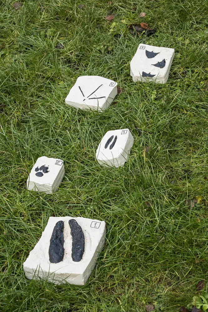 Gipsavtrykkene på bildet her er laget av biologene som jobber på Besøkssentervåtmark Nordre Øyeren. Spor fra bunn: 1: elg 2: rev 3: rådyr 4: gråhegre 5: andeart. Foto: Øivind Møller Bakken/MiA