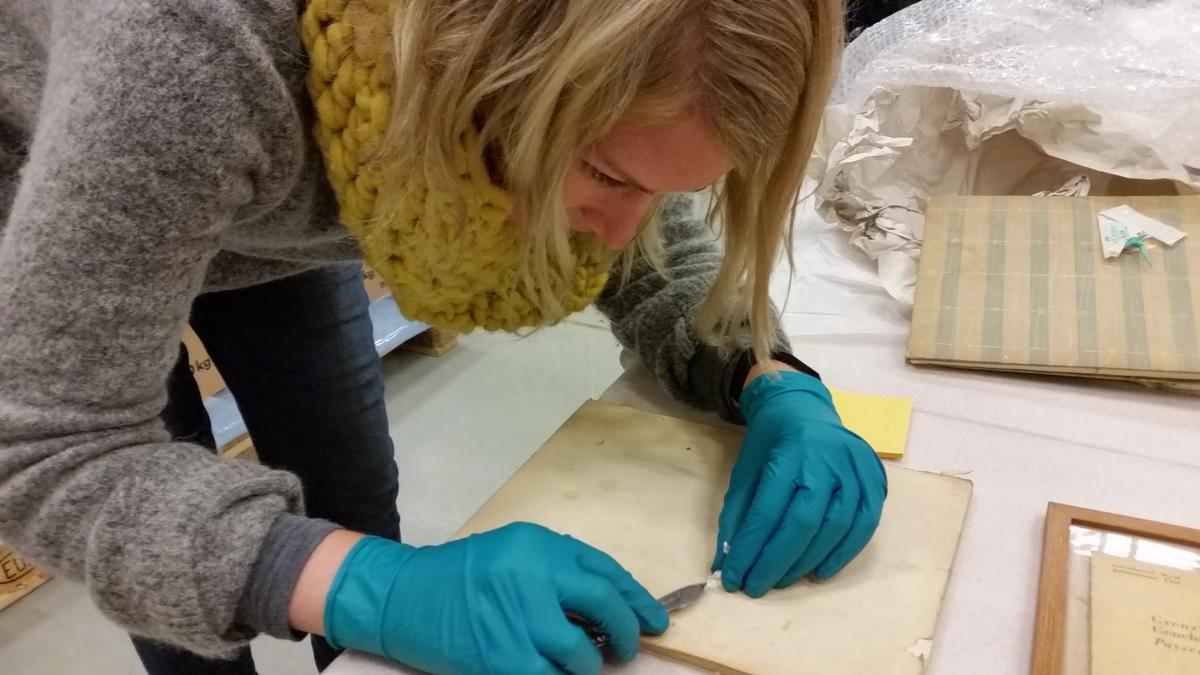 Konservator Kristine Draugedalen fjerner gammel heftemasse fra utsiden av en dagbok fra Grini. Foto: Camilla H. Maartmann/MiA
