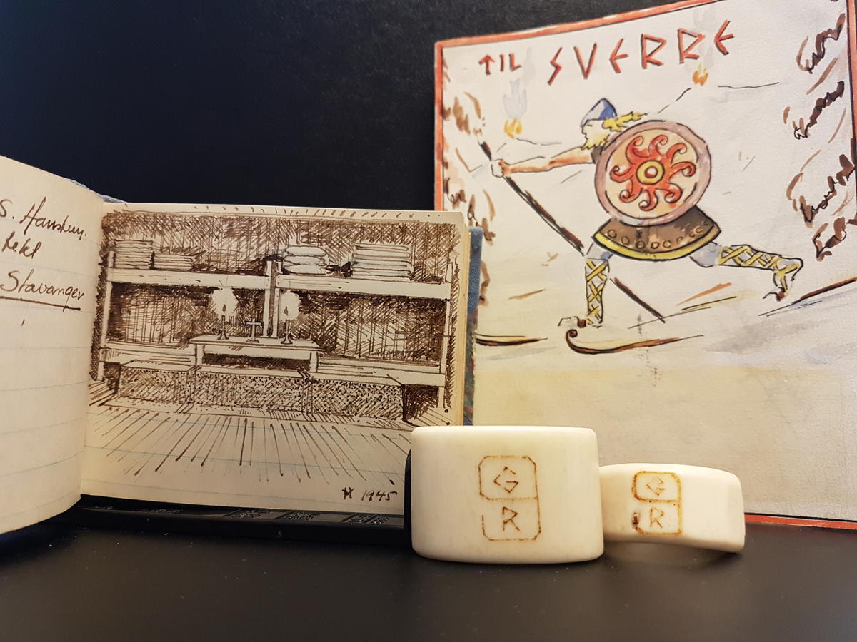I Sveinars minnebok, til venstre på foto, ser vi tegning av nattverdsutstyret han laget. Dette var utstilt i det gamle Grinimuseet og oppbevares nå på MiAs fellemagasin inntil videre. Gjenstanden til høyre er et kort han fikk laget til sønnen Sverre som bare var 9 år da faren ble arrestert. Kortet inneholder underskrifter til den tidens idrettshelter, som også satt inne på Grini. Det var bl.a. hopperne Birger og Asbjørn Ruud fra Kongsberg, og tennisspillerne Reidar og Johan Haanes (stifterne av sportsklubben Njård i Oslo). Serviettringene er laget av bein og pyntet med Grini-symbolet.