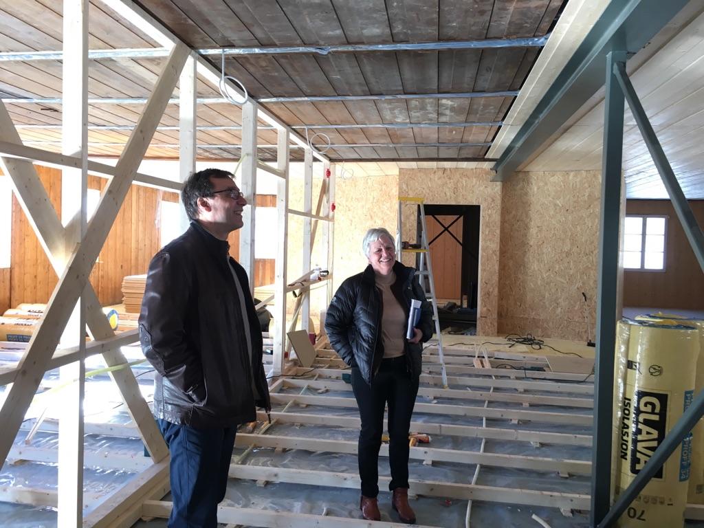 Artist Per Vollestad og Kari Amundsen, leder for museumstjenesten, beskuer byggearbeidene inne i brakka. Foto: Kjersti Lillebø/MiA