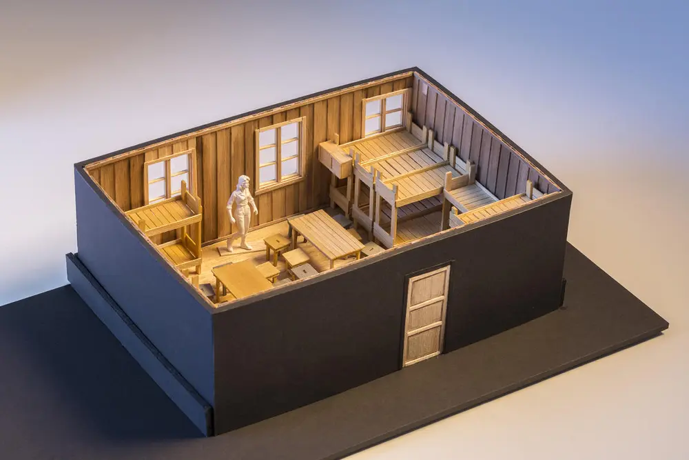 Nå begynner for fullt arbeidet med å rekonstruere et fangerom i brakka på Grini. Fangenes tegninger, fotografier og dokumenter er viktige informasjonsbiter i et puslespill som skal sikre at rommet blir så autentisk som mulig. Utstillingsdesigner Christine Lohre presenterte en 1:25-modell av rommet for ansatte på museet. I det faktiske rommet skal det bli plass til 8 køyesenger, vedovn, kjøkkenkrok, to bord og 16 krakker. Publikum skal få opplevelsen av hvor trangbodd det var på de 37 kvm som fangene delte. På det meste bodde det 40-50 personer i dette rommet der trangboddhet, orden, regler og sosiale relasjoner preget hverdagene.