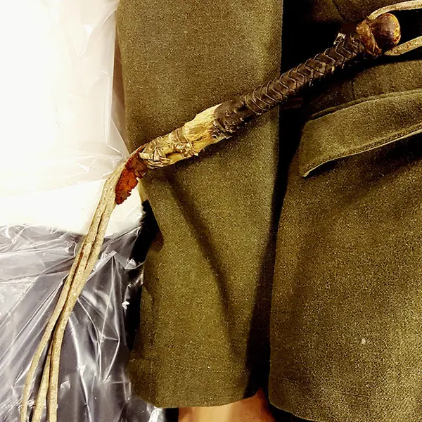 Vi fortsetter å registrere gjenstander fra Grinimuseet, og finner stadig flere spennende ting. Denne pisken er trolig lagd av et rådyrbein, noe som visstnok ikke var så uvanlig. Den ble tidligere utstilt på «Kunze»-dukken. SS-Scharfführer Walter Kunze var den mest beryktede fangevokteren på Grini. Vi vet ikke om pisken faktisk tilhørte ham, eller ble lagt til senere, men den er likevel en veldig iøynefallende gjenstand. Det samme kan sies om denne «Kunze»-dukken, en utstillingsdukke som byr på en rekke konservatoriske utfordringer. Dukken viser hvordan fangene husket den grusomme fangevokter Kunze, og kan derfor sies å ha en egen kulturhistorisk og kunstnerisk verdi, men er for skjør til å utstilles for tiden.