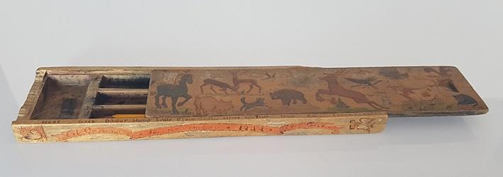 Dekorert pennal av tre. Foto: Elisabeth Kristoffersen/MiA