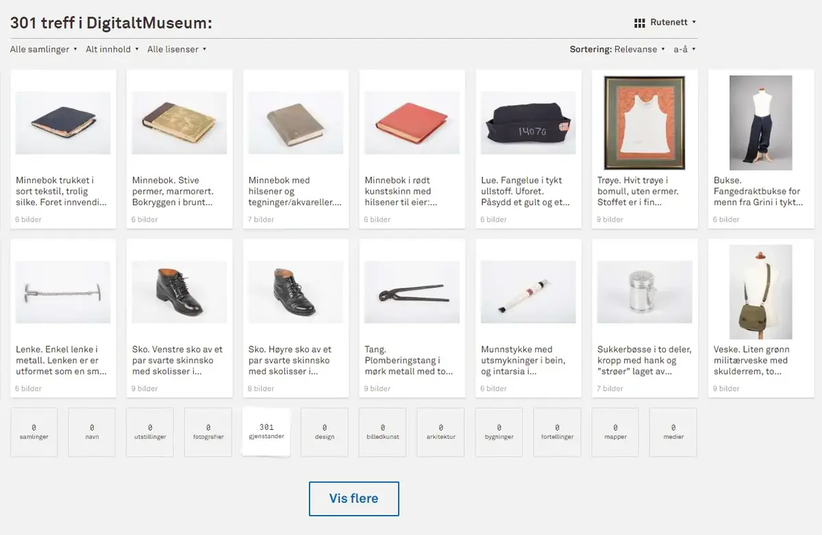 Blant de mange fine gjenstandene er det blant annet minnebøker, treskåler og keramikkrus som er laget av fangene selv under krigen. I tillegg finner du klær som for eksempel bukser, jakker og luer som var en del av fangedrakten på Grini. Se alle gjenstandene på digitaltmuseum.no.