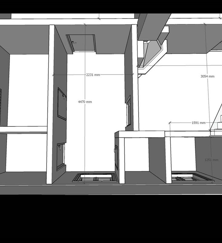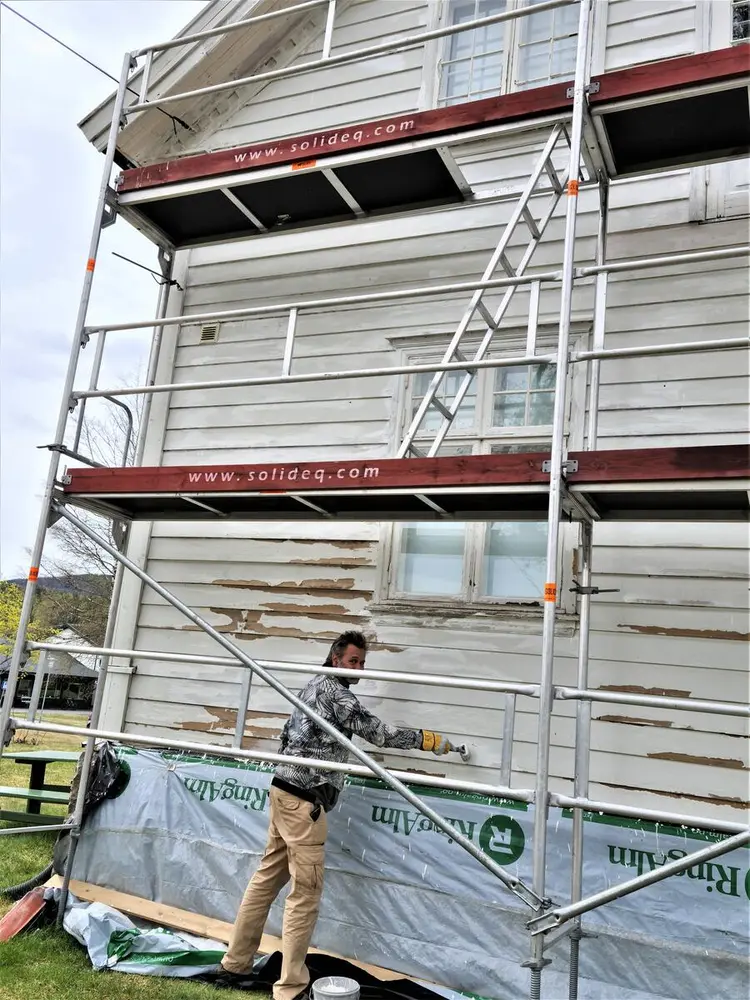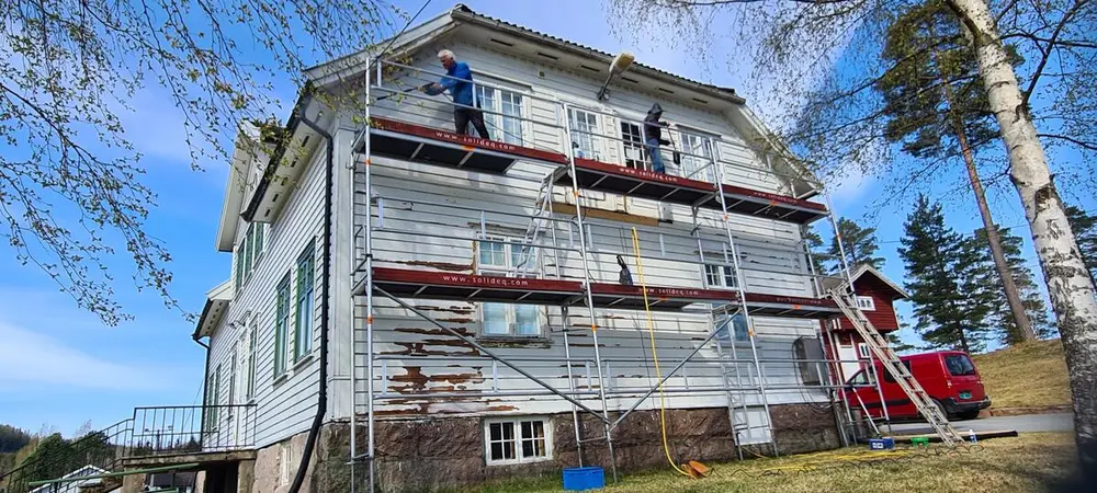 Da vi først var i gang, bestemte vi oss for å male veggen før vi monterte ny rømningsveg. Vi har vasket, skrapet, reparert litt, grunnet og malt to strøk. Vi fortsetter med de tre andre veggene.