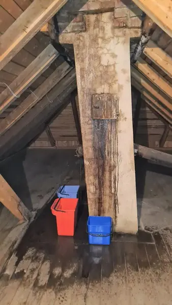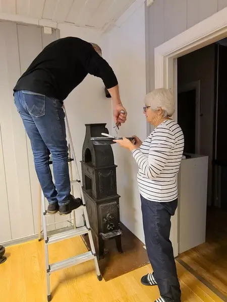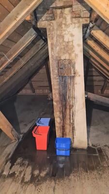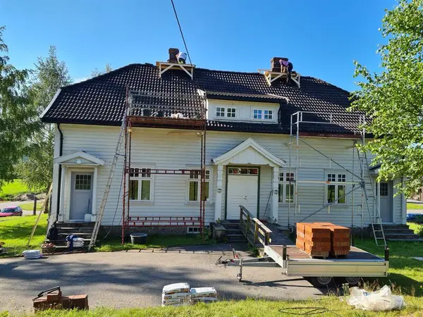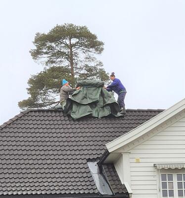 Etter et kraftig regnskyll oppdaget vi at det lakk inn vann ved overgangen mellom taket og pipene. Heldigvis hadde vi flinke og modige dugnadsfolk som fikk dekket pipene midlertidig med presenninger. Profesjonell murer måtte til, så nå er pipene reparert og begge har fått nye beslag.