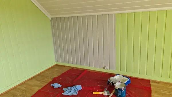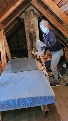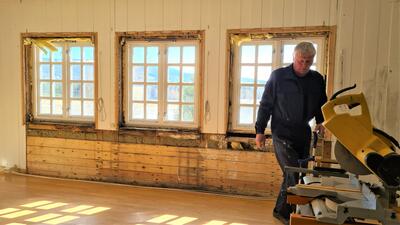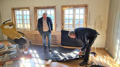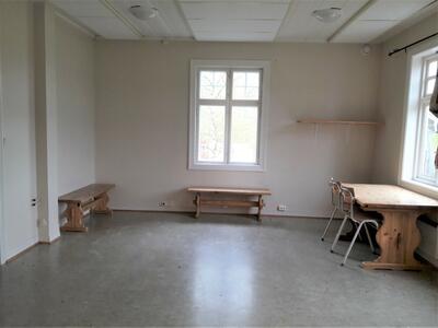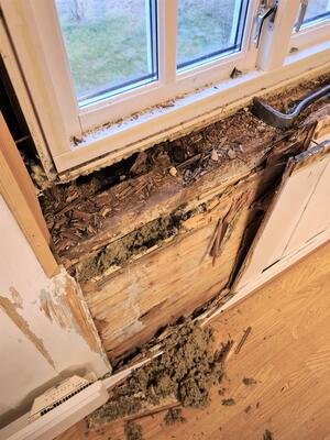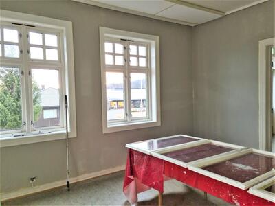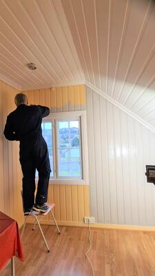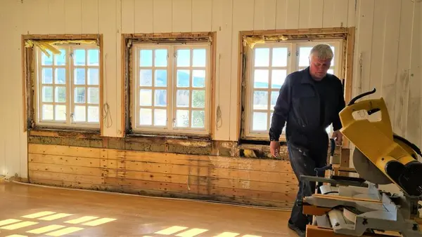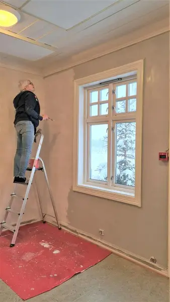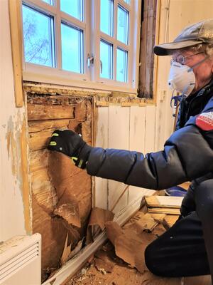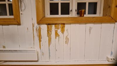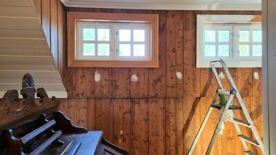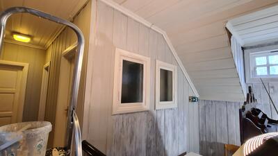 Da vinduer og vegger skulle males i møterommet i 2. etasje oppdaget, vi at veggen under vinduet var vannskadet. Da måtte panelet rives, den gamle isolasjonen tas bort og veggen gjenoppbygges. Nå er vinduene tettet og isolert rundt på riktig måte.