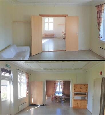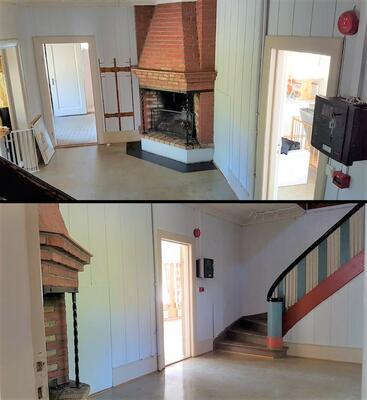 Hulderhaugen består av flere hus: Doktorboligen, Drengestuen og Låven. Doktorboligen skal romme utstillingsrom, kafe, møterom og magasiner. Slik så rommene i Doktorboligen ut før vi startet opp oppussingen. Lyse og gode rom, men de trengte et malingsstrøk.