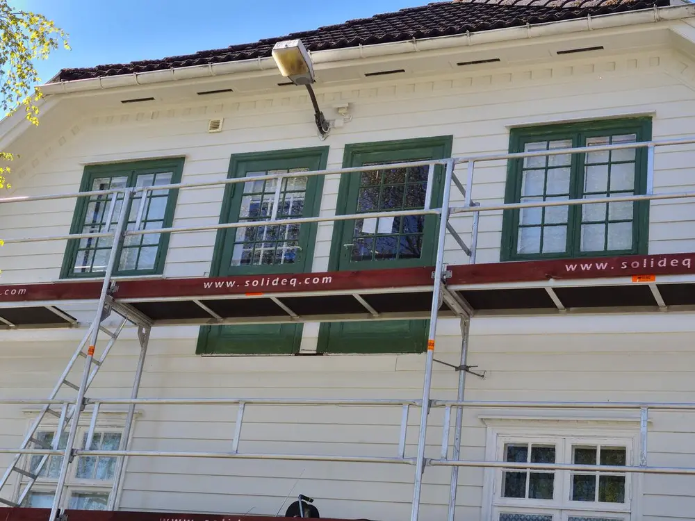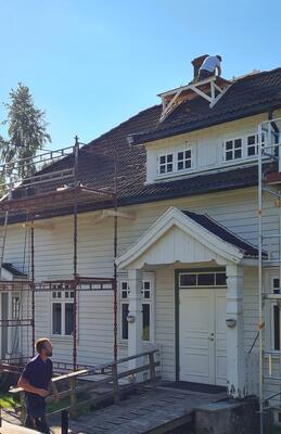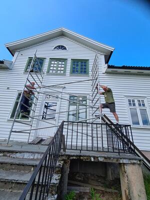 En stor jobb var å få fasaden på Doktorboligen fin. Vinduene trengte restaurering og nymaling. Av en eldre modell av Doktorboligen kunne vi se at huset opprinnelig hadde grønnmalte sprosser og vindusrammer. Vi tilbakefører derfor til opprinnelig fargesetting og synes det er blitt ganske så fint.
